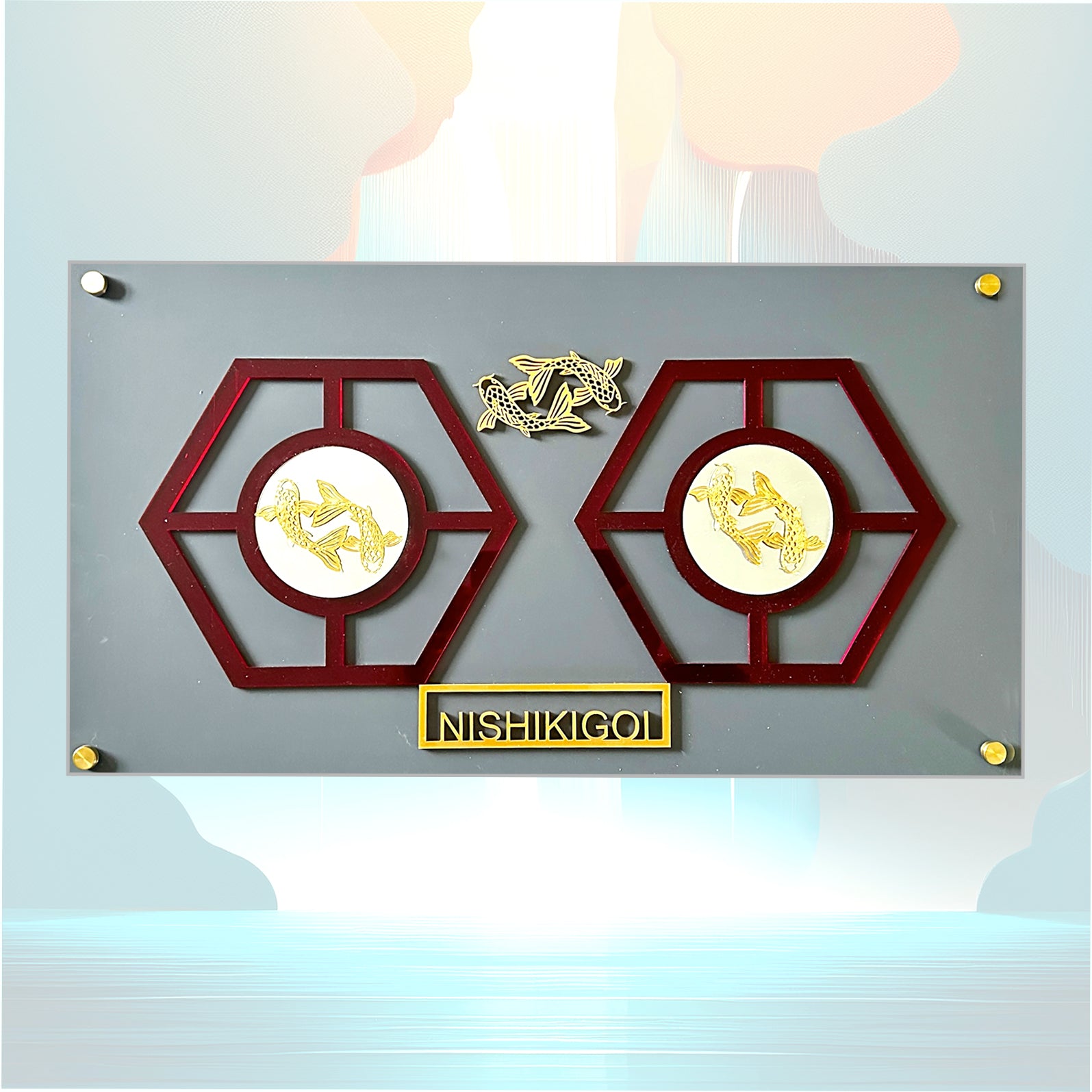 Exquisitely crafted from Perspex acrylic, this Double Mirror Koi Plaque presents an elegant geometric composition. The sophisticated design showcases laser-cut red acrylic embellished with mirror Perspex insets, each adorned with gracefully intertwining koi pairs. Mounted on refined anthracite acrylic, the plaque features a gold-effect tablet inscribed with "Nishikigoi." Complete with stainless steel fixtures, this UV-resistant and weather-durable artwork elevates both indoor and outdoor spaces with its distinctive aesthetic. Dimensions 500mm x 280mm