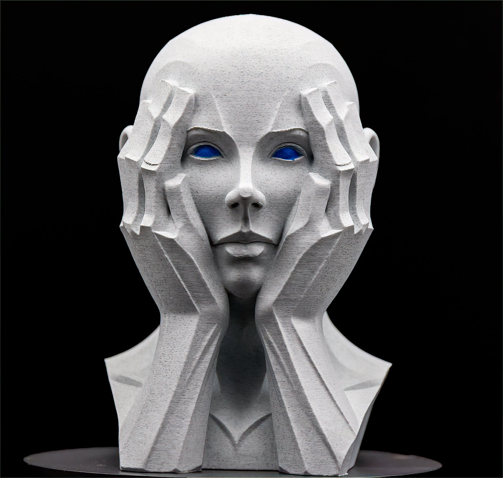 Just a Little Blue is an original sculptural piece conjured entirely from imagination, exploring emotion through sharp geometry and restrained form. The angular planes and faceted hands frame a calm, almost distant face, creating a quiet tension between strength and vulnerability.