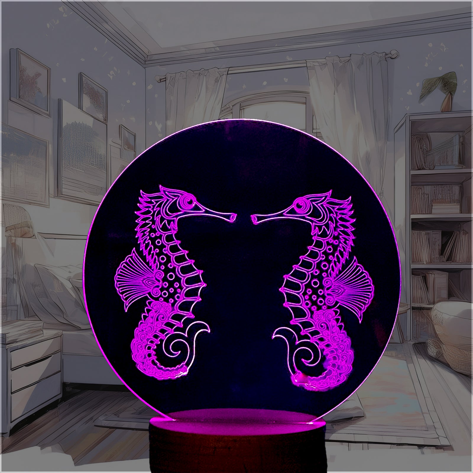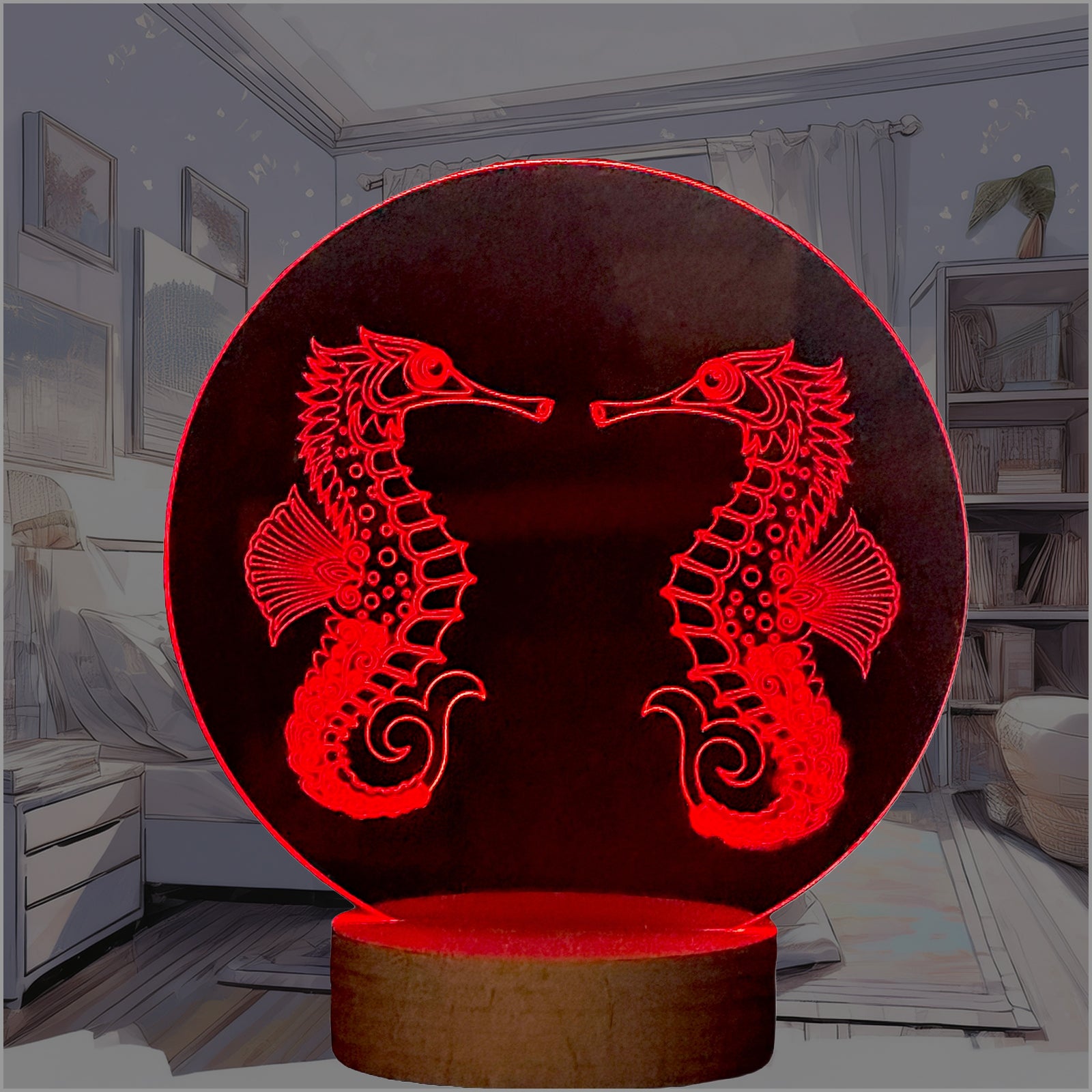 Cut and engraved from clear Perspex. Mounted on a quality wooden base. Which house's the LEDs. The light is colour changing and can be changed using the control pad.The selectable colour options available are Red, Green, Blue, Pink, Yellow, Light Blue, White.These can be set to change constantly or have one specific colour. You can also control the brightness. Perfect for any occasion. The Perspex plaques are changeable with other designs (optional extra) Children love them as night lights. Many other designs available. Can be personalised with Names or Logos. Powered by USB or power pack (not supplied)
