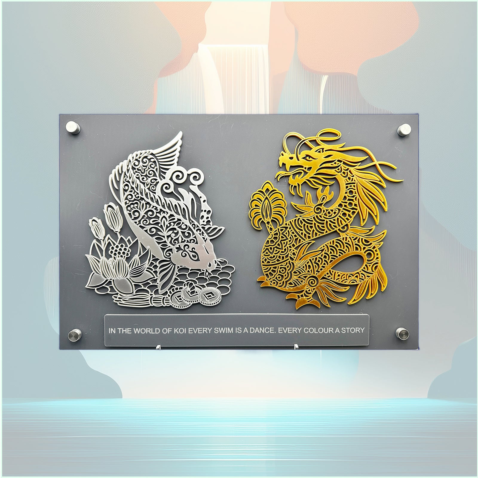 Elegant laser-cut plaque depicting the mythical koi-to-dragon transformation—a timeless symbol of achievement. Meticulously crafted from gold and silver acrylic on anthracite background. Carrying a tablet inscribed with "Every Swim a Dance. Every Colour a Story" Substantial 440mm x 230mm dimensions with premium stainless steel fixtures. Weather-resistant Perspex suitable for interior or exterior display.