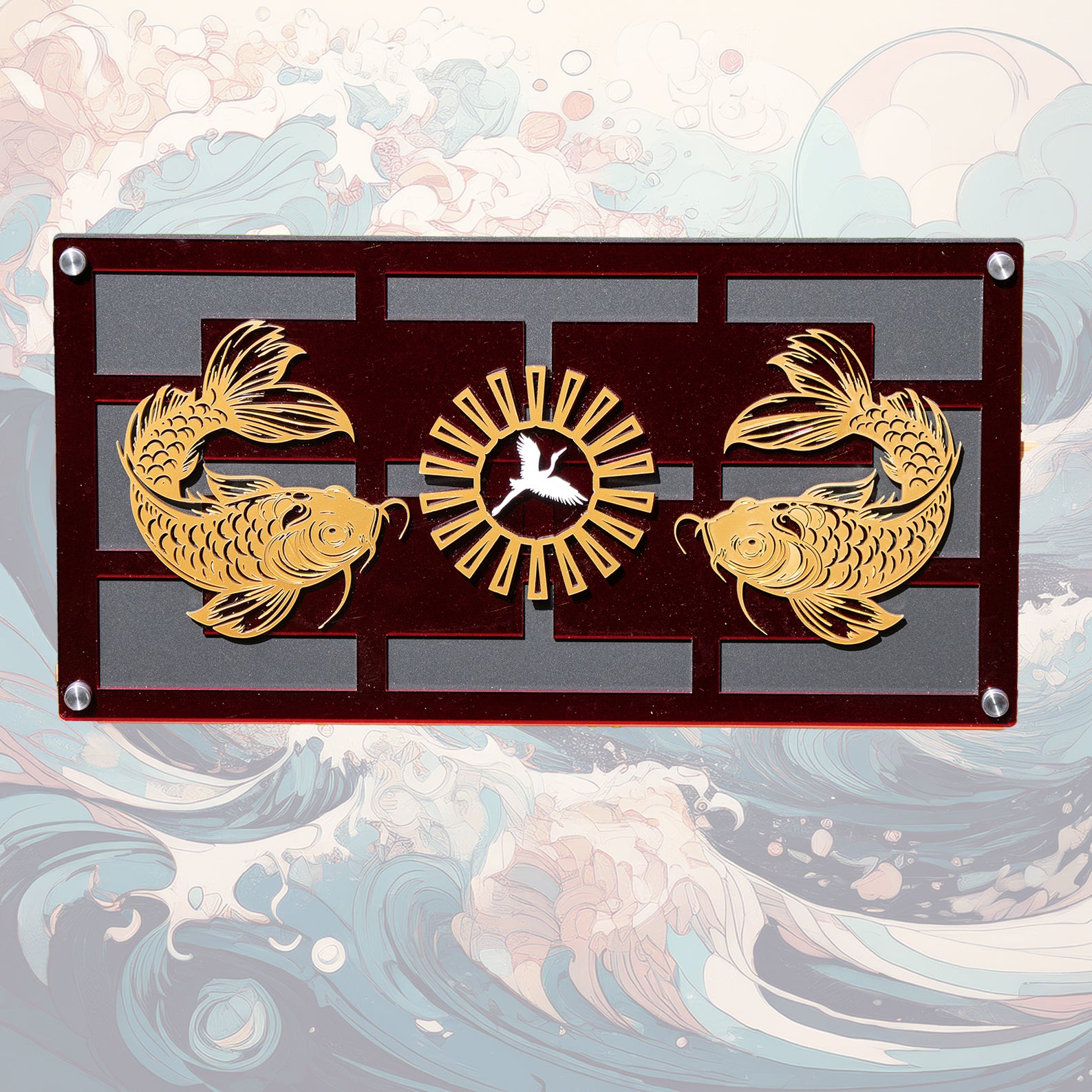 This beautiful plaque, measuring 440 x 230 mm has a real wow factor. Featuring two Gold effect acrylic koi, rising sun motif embellish with a white crane in flight. Bonded onto a intricate red geometric shape. Mounted on anthracite Perspex supplied with stainless steel stand off wall mounting fixtures.