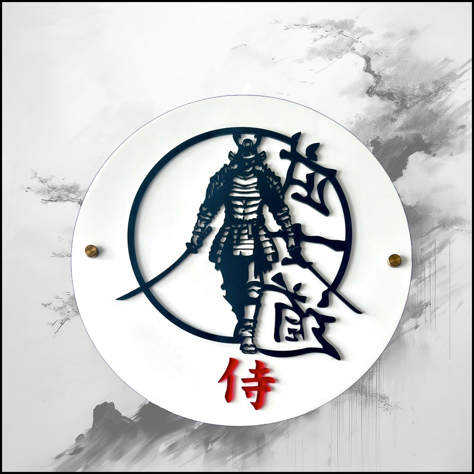 This stunning plaque features a samurai warrior laser cut from matt black acrylic on white acrylic 320mm circular background. The addition of the red kanji symbols adds to the overall effect. Complete with stainless steel stand off fixtures. A sure talking point within your home or garden. Perspex has excellent weathering durability. Can be supplied in various sizes and colour combinations.